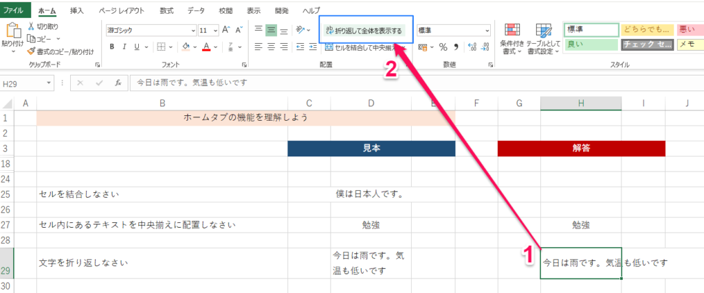 Excel基本⑬セルの配置:文字の折り返し コメントする / Excel / By hiroyukiabe 【完成図】 【手順】 ❶今日は雨です。気温も低いですと記載 ❷□折り返して全体を表示を選択する 執筆者 長門市仙崎のパソコン教室&販売ミスターバンブー