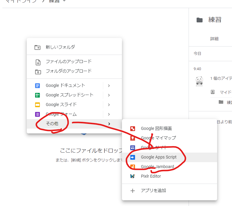 - 練習フォルダ内右クリック→その他→Google Apps Scriptを選択